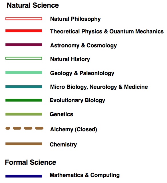 ในแผนที่เริ่มตั้งแต่ยุคเริ่มต้นของวิทยาศาสตร์สมัยใหม่ เมื่อศตวรรษที่ 16 จนถึงปัจจุบัน โดยใช้ชื่อของนักวิทยาศาสตร์ชื่อดังเป็นสถานี และสายต่างๆแยกสีตามสาขาของวิทยาศาตร์ ดังนี้